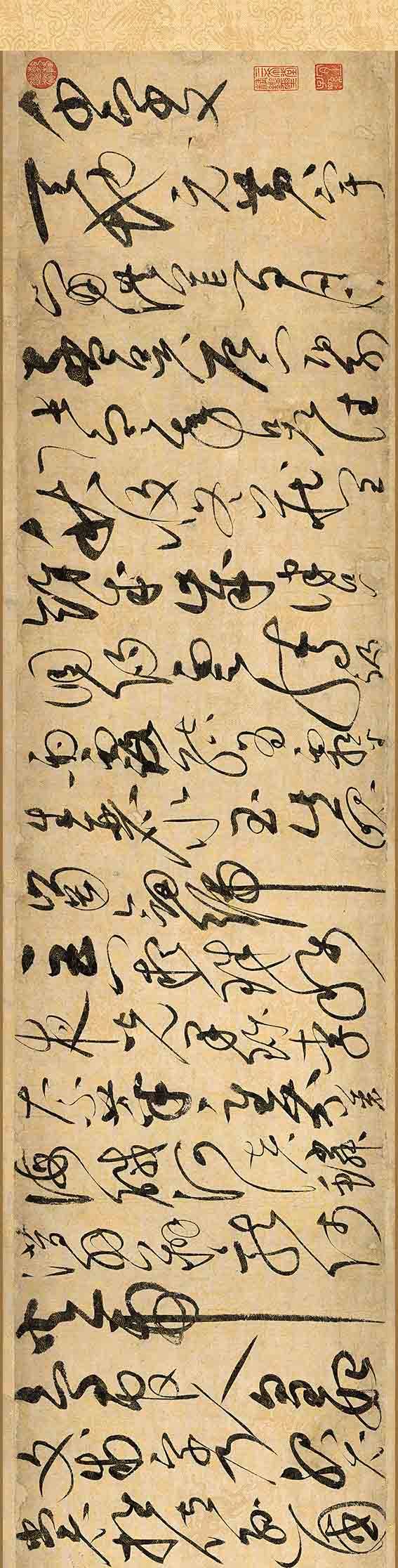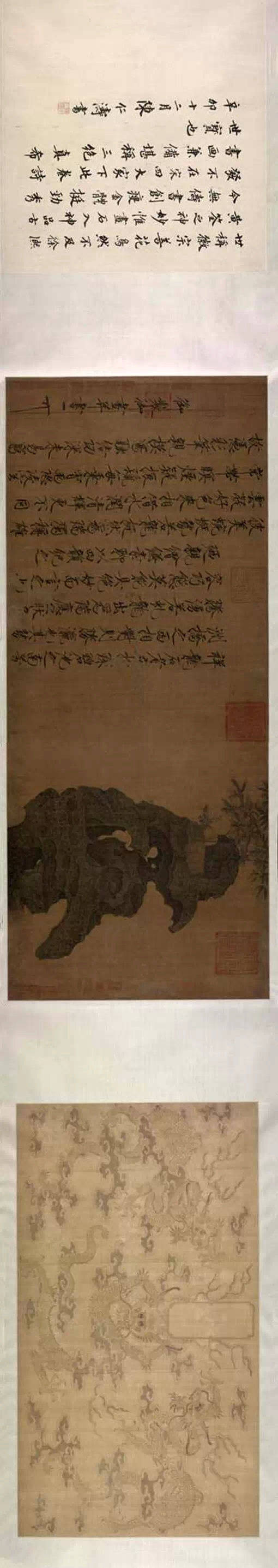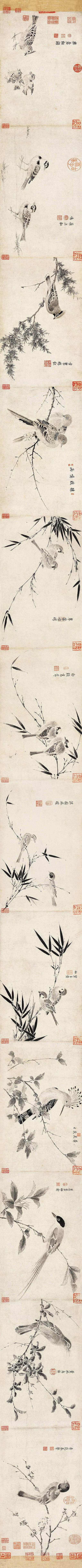 本幅款押“天下一人”。钤“御书”朱文葫芦形印一方。裱边题签:“宋宣和枇杷山鸟”。鉴藏印钤“宣统御览之宝”,中缝钤“八征耄念之宝”、“太上皇帝之宝”朱文印各一方。图中枇杷果实累累,枝叶繁盛。一山雀栖于枝上,翘首回望翩翩凤蝶,神情生动。此图体现崔白清澹之体。宋徽宗赵佶的花鸟画以设色为多,然而此图纯以水墨勾染而成,格调高雅,略似没骨画效果,别具一种苍劲细腻之韵致,体现了赵佶多方面的绘画才能。对开有清乾隆御题诗一首:“结实圆而椭,枇杷因以名。徒传象厥体,奚必问其声。鸟自讬形稳,蝶还翻影轻。宣和工位置,何事失东京。”感慨宋徽宗如此精于绘画,工于构图和经营位置,缘何却把国家丢失了?