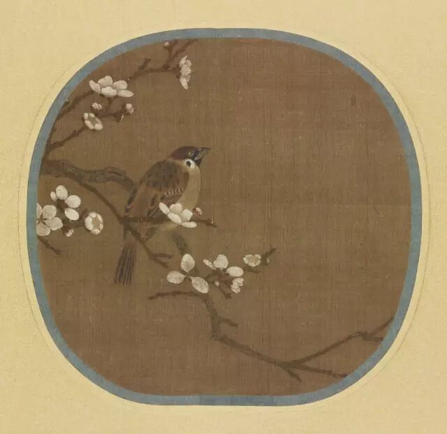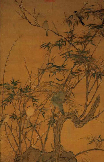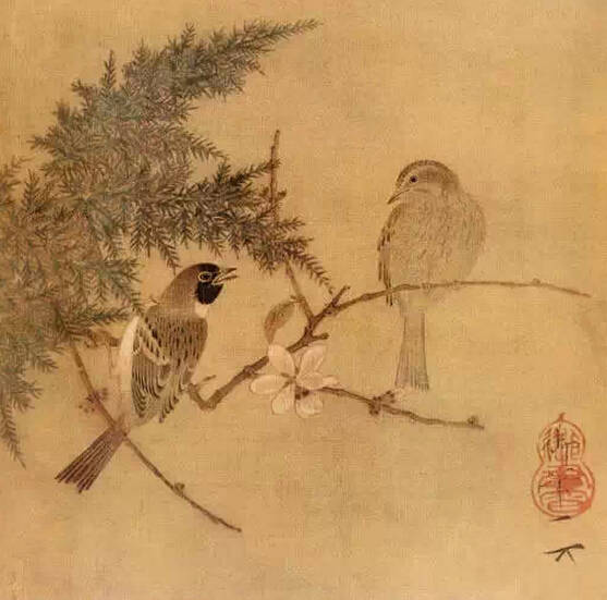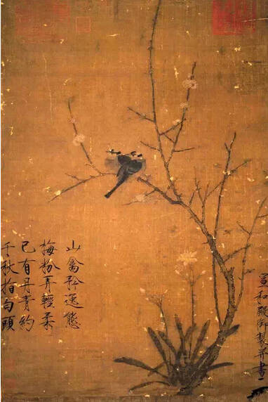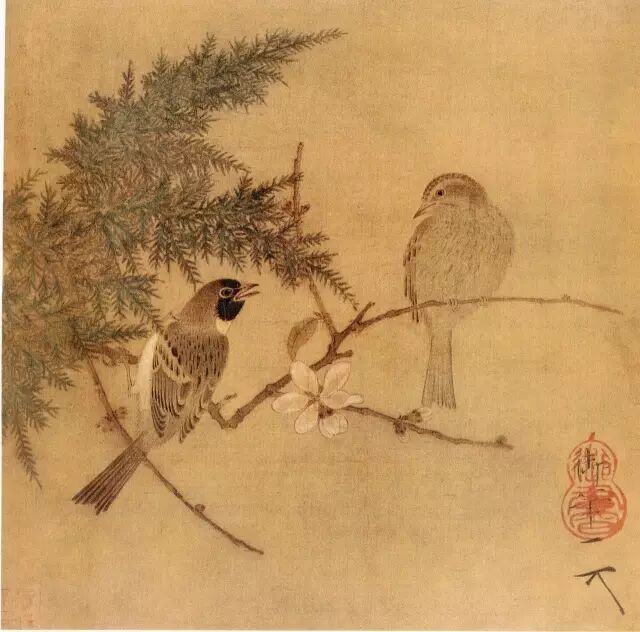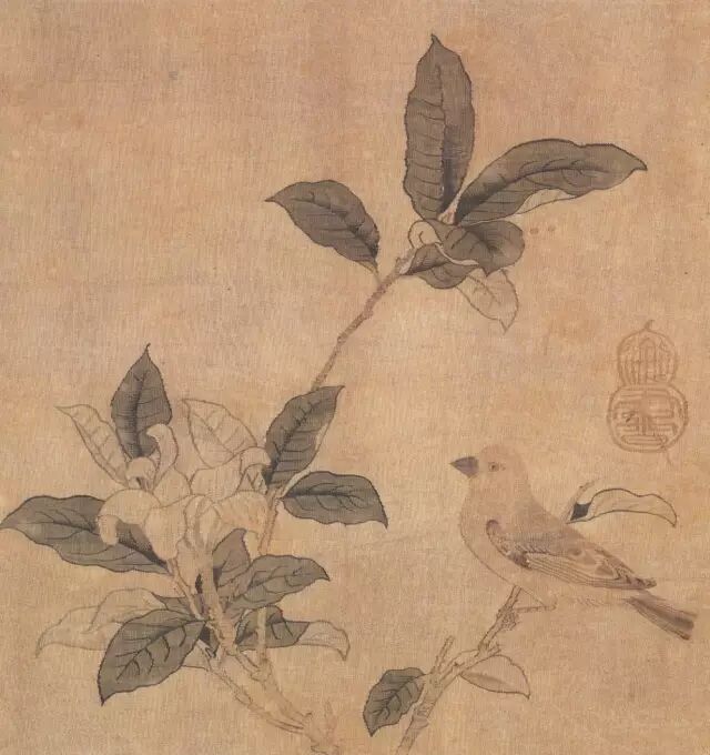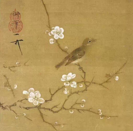 此画以细腻的笔法描绘交叠生长的柏稍与腊梅,梅枝上一对山雀相视而鸣,白梅点缀其间,春意微露。山雀的眼睛以生漆点绘,神采奕奕。这是赵佶擅长的点睛之法。画面右下角题“天下一人”,其上钤“御书”葫芦形印。左下角钤清代鉴定家“于腾私印”。