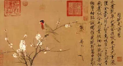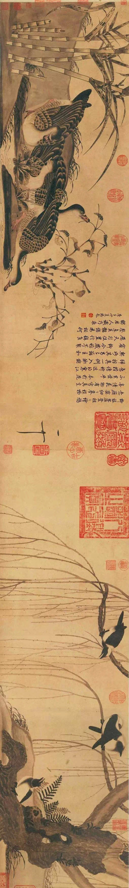 《芙蓉锦鸡图》是中国历代经典名画中的精品,风格殊异、妙笔纷呈。宋徽宗赵佶以其独特的艺术天赋和精湛的绘画技巧,使用笔和设色这两大中国传统绘画技法的元素达到完美的统一,且以特有的笔调活灵活现地传达出所描绘对象的精神特质,达到了高度成熟的艺术化境,使其作品栩栩如生、流传千古。