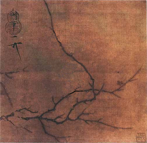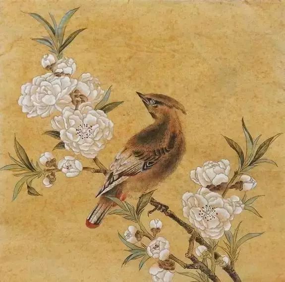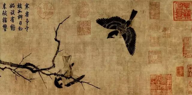 此册页在传为宋徽宗的作品中比较特别。桃花与枝叶钩勒精工,栖鸠动态自然而生动,用生漆点睛,卓有神采,整体色彩华丽,瘦金书稍稚嫩。这样的风格被认为是徽宗早年的画笔,传其为画家二十六岁时的作品。此图流传日本已久,长期以来被作为徽宗的真迹,受到良好的保护,现在是日本的国宝级文物。本图有“大观丁亥御笔天”的题记,丁亥年是1107年,这一年徽宗26岁,是画家早期的作品。