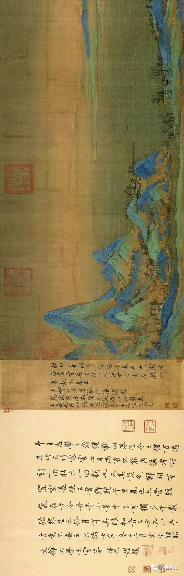 大概意思是说:当年宋徽宗创办了一所美术学校——画学,希孟就是这里的学生,这里的尖子生可进入翰林院,但希孟被分配去了文书库。他经常作画进献给徽宗,但画得并不是特别好,然而却引起了徽宗的关注,觉得这孩子孺子可教也,于是就亲自对他指点传授。不到半年,十八岁的希孟就画出了《千里江山图》献给宋徽宗。宋徽宗看了很高兴,就把这幅画赏赐给了蔡京。