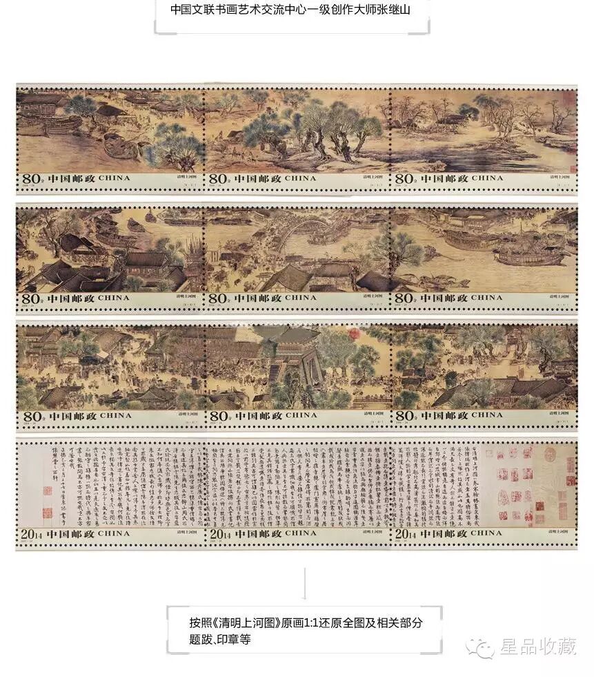 【发行背景】,中国邮政首次发行了《清明上河图》邮票,全套9枚,首尾相连,用邮票的形式再现了国宝文物《清明上河图》。清明上河图邮票被誉为众多作品中最为传神和精美的传世邮票,在第十一届国际政府间邮票印制者大会上,荣获专家奖、优秀奖和“群众最喜爱的特别邮票”奖。2014年,,同时,也是中国邮政成立65周年,中国邮政特批准发行了《清明上河图》邮票丝绸钞券珍藏版。大师介绍:张继山,字文旭,墨缘斋主人。现为中国文联书画艺术交流中心一级创作员、中国书法家协会会员。自幼酷爱书法艺术,数十年笔耕不辍遍临诸家碑帖,受到当代书法家启功、启襄、刘炳森等名家的指点,深悟历代书法大家真谛,其精通以行书见长,行书行云流水,自然天成,深得社会各界人士赞赏。其多幅作品被国际知名人士和中国美术馆、。