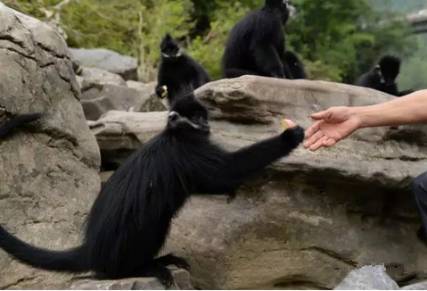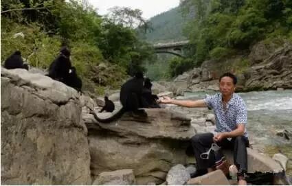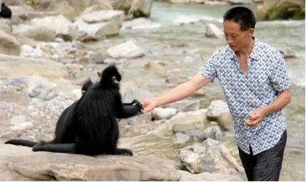 “老黑哟!老黑哟!”随着山脚下一声吆喝,10余只黑叶猴从山上欢快地奔来,抢吃他手中的玉米,并与他亲切地握手。他是全世界唯一能把野生黑叶猴唤到身边进行喂食的人——肖志坚,是“猴王”哟!