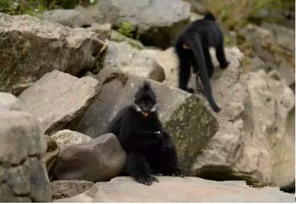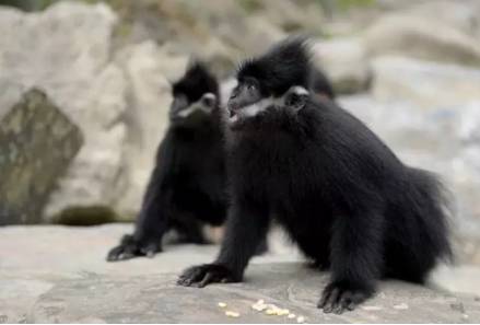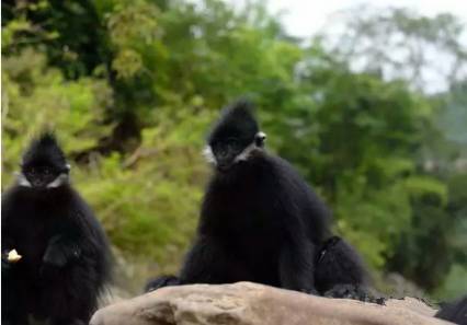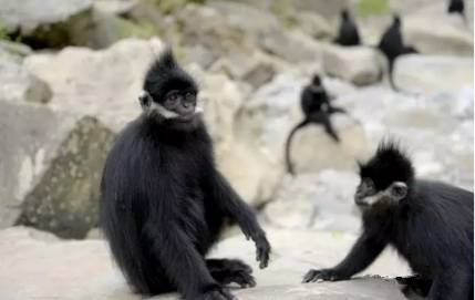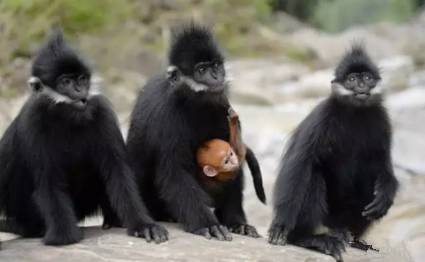 黑叶猴喜爱群居,每群一般为3-10只,较大的群体约有20只左右。图中,是黑叶猴一家。