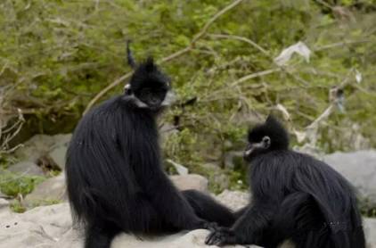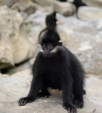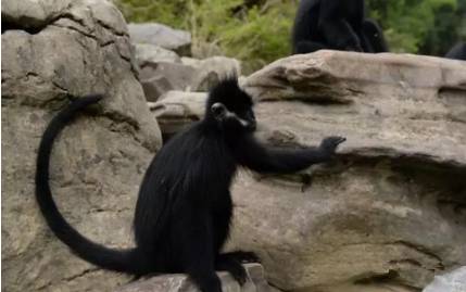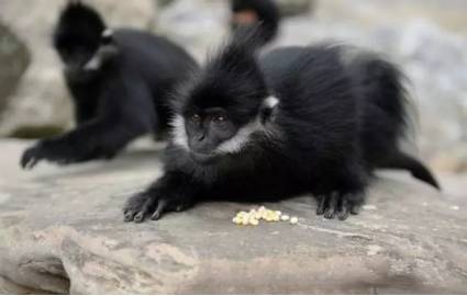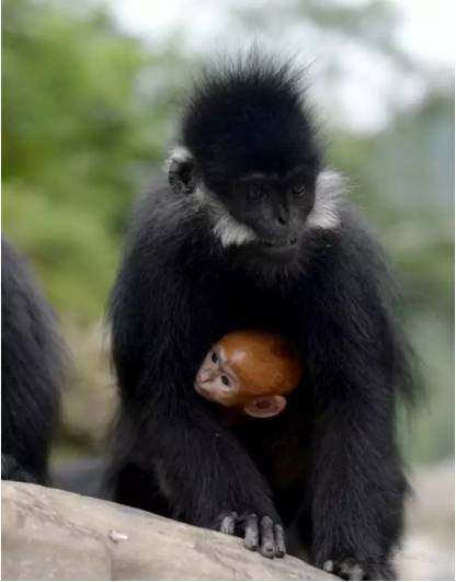 刚出生的小黑叶猴,全身乳黄色,头部则为金黄色,尾为黑色,30天左右全身变黑,但头部还是金黄色。