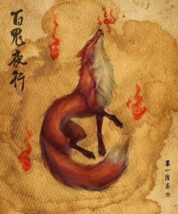 狐火(磷火)-「图百鬼夜行·阴」 民间谣传是狐狸所点的火。根据《北越雪谱》的记载,狐狸会从嘴巴吐火。不过,仔细看则是狐狸呼出的气体在空气中燃烧。成精的狐狸妖怪都会在除夕之夜,聚集到江户,无数的狐火飘舞,蔚为壮观……昼夜交接之时,便发生火灾