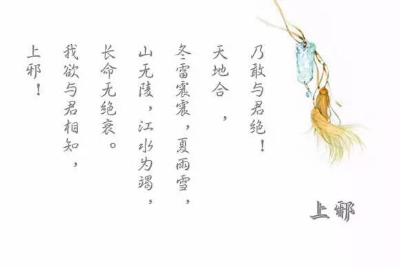 (“邪”读作“yé”)出自于汉乐府民歌。《上邪》是一首情歌,是女主人公忠贞爱情的自誓之词。被誉为“短章中神品”。