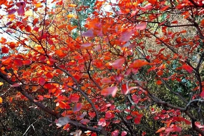 白龙潭风景区红叶种类非常多,从10月底一直到11月中旬都是白龙潭赏红叶的好时节。枫树、黄栌、火炬、橡树,都已经陆续准备呈现出最艳丽的色彩。火炬树红得早,呈现出“枫红叶浓半山火,苍松叠翠还有青”的景象。拾阶而上,落叶撒满山中石阶,两旁的枫林高低掩映,疏密相间,红影闪动,美丽异常!