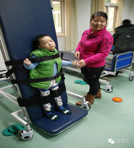 在四川省八一康复中心内,,他正在接受一系列的康复治疗,当我们伸手向他示好时,他的左手也轻轻地握着我们的手,看到别的小朋友,他会露出微笑。贺勇兵说,,这也让他有了更大的动力要为儿子治疗。
