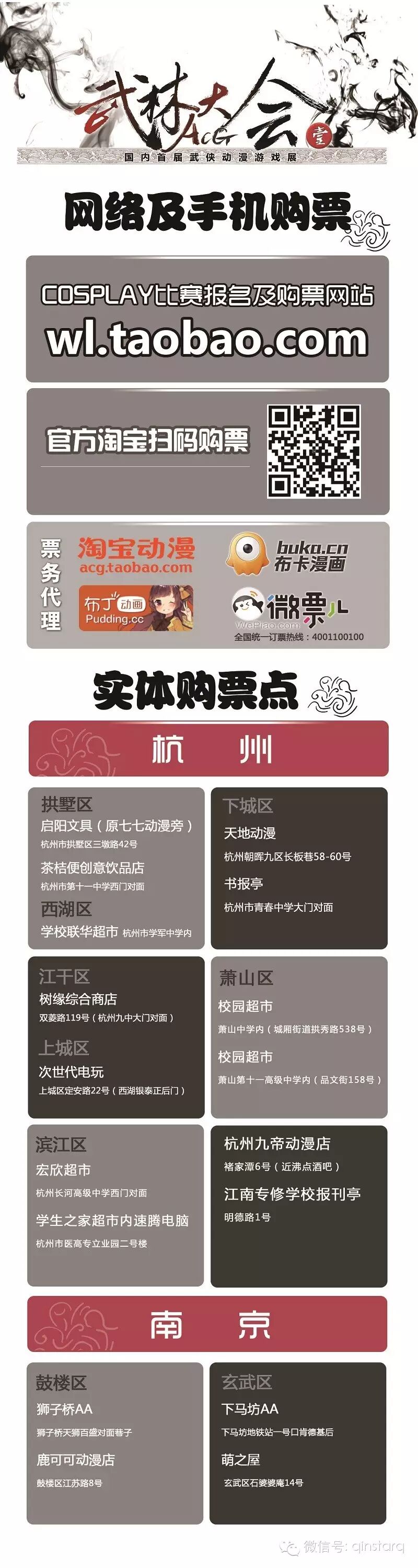 本届“ACG武林大会”由玄机科技、动漫东东、ACG联盟联合发起,淘宝动漫、土豆动漫、优酷动漫、BILIBILI、浙江在线、杭州国家高新技术产业开发区联合主办,欢迎登陆官方网站查看详情,当然,扫一扫微博二维码也是可以的咯。