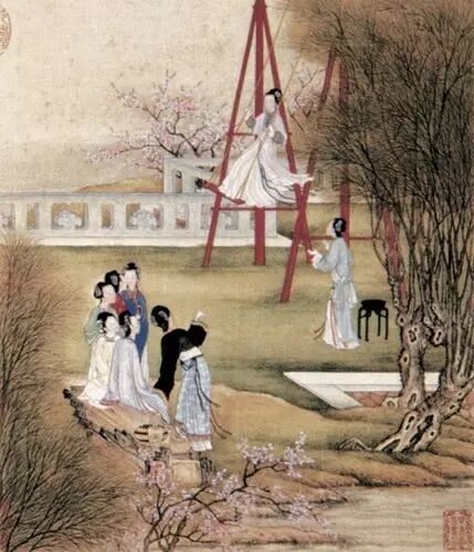 秋千也是清明盛行的一种游戏,源自先秦,唐宋尤盛。宋代出现了“水秋千”。南宋吴自牧《梦粱录》记载,水秋千表演时,先在水中两艘大船上竖起高高的秋千架,船尾杂耍艺人先耍练上竿,然后表演者按次序登上秋千,奋力悠来荡去。当秋千悠到和秋千架的横梁相平之时,双手脱绳,借秋千回荡之力跃入空中,在空中翻个跟斗,投身入水。这般说来,秋千已属杂技了。在明朝时,清明节定名为秋千节,行于城中及郊近各村,常可瞥见恣意出墙的秋千架。传说荡秋千的功效有两种,一方面可“摆疥”(医治疾病),另一方面可以“释闺闷”。《词话》第25回开头写吴月娘、孟玉楼、潘金莲、李瓶儿等在花园里荡秋千,很好地释了“闺闷”。