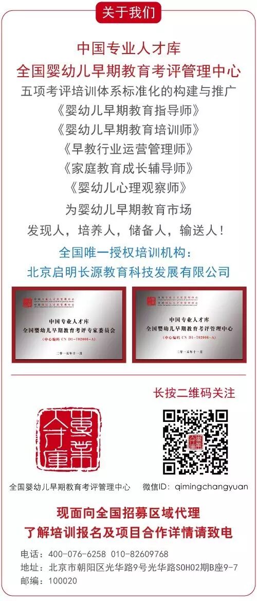 全国婴幼儿早期教育考评管理中心,中国早期教育行业中具备颁发专业性、权威性早教行业从业资格证书的管理机构。微~信~搜~索:qimingchangyuan,了解更多专业育儿知识、家庭早教方案、早教行业资讯。官网地址:www.qimingchangyuan.com