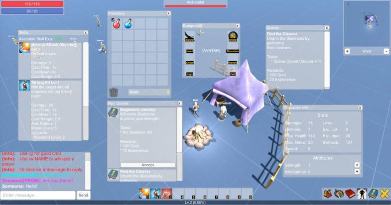 一个完整的MMORPG游戏示例,其中包含所有多人联网游戏的所有核心系统,网络部分基于Unity自带的UNET实现,提供客户端与服务器脚本,所有UI部分均通过UGUI实现。包含玩家、怪物及NPC角色,提供战斗系统、导航系统、3D模型与角色动画、局域网聊天室、小地图、技能与Buff攻击、道具拾取与仓库系统、商城系统、角色交易系统等等。功能易用且完整,适用于多种不同平台的RPG与MMORPG游戏。