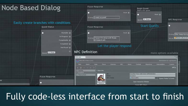 提供完整的RPG游戏示例与无须编码的编辑器界面,能够在短短几小时内仅通过拖拽操作来实现一款RPG游戏,其中包含20多个常见的RPG游戏系统,均可以在插件提供的编辑器中完成配置。可利用基于节点的编辑器界面来自定义过场动画与游戏任务系统等内容。
