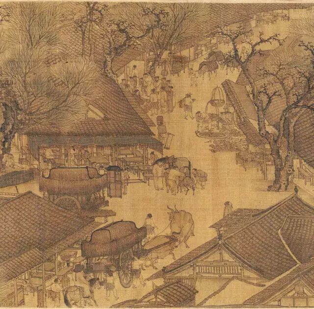 清明上河图中各式各样的商业活动包含卖酒的、谷物市场、二手商品店、厨具店、弓箭店、灯笼店、乐器行、金饰行、布庄、画廊、药店、餐厅等应有尽有。在虹桥上,小贩更是琳琅满目。除了商店和小吃店以外,画面中还包含许多旅店、寺庙、私人住宅、官邸,各式各样的房舍。、和载人的游艇,河边则有一些苦工在拉着大船使其靠岸停泊。