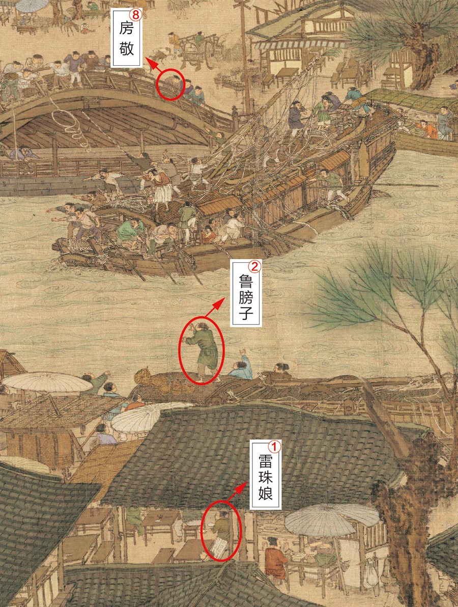 正由于这一危机,将桥头、两岸数百人目光全都聚集到一处。船上正一片忙乱地降桅杆,岸边也一片大呼小叫,岸上、桥上、所有的人都朝那艘船涌去,汴河两岸,左岸开食店的章七郎,开客店的房敬、力夫刘石头,右岸温家茶食店里端菜的使女雷珠娘,守船的鲁膀子,看茶棚的严老儿,似乎都被同一根绳子牵着,绳子一收,。像是要奔赴一个等待已久的大事情。