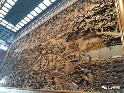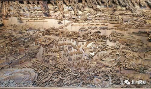 抚州版《清明上河图》长14.8米,宽7.35米,是广州大学美术学院院长、教授、著名水彩画家、中国美术家协会会员汪晓曙所创作,由中国工艺美术大师、中国木雕艺术大师、“东阳木雕”传承人、业界“金手指”黄小明用进口楠木叠雕而成。抚州版《清明上河图》内容以康公庙会、赣抚粮仓、江右邦、书院文化以及名胜古迹、风俗民情为背景,展现秋季七月宋代抚州物华天宝、人杰地灵、一派政安民乐的繁华文明景象。