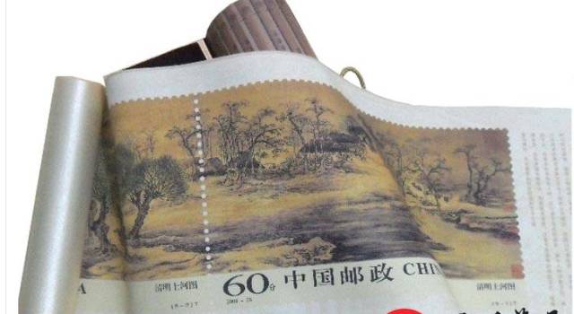 ◆第一套带有中国邮政标定的法定面值,按故宫博物院馆藏真迹等比例制作发行的“清明上河图”国宝丝绢大邮票。