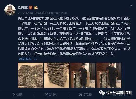 还记得一个多月前,岳云鹏发的一篇微博不?当时雷佳音送给小岳岳的女儿一件三万多块的拼图,据说只有三个人成功拼成功过……当时岳云鹏就表示回什么礼物才能不输这一仗?