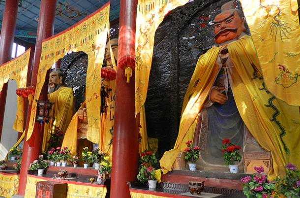 殿内伏羲像居中,炎黄二帝塑像分列左右。三人皆中华民族始祖,华夏文明的肇造者。大殿顶部据《易经》"观天象于天"语,底为天蓝色,中有伏羲六十四卦方位园图,卦象黑白相间,中为金色北斗七星图,斗柄回转,指寓四季。椐《易经》"时乘六龙以御天语",顶部两侧各绘龙三条,金四乌二。其核心和本源,则是易学。因此进入大殿,游客要抬头看看天花板,不然又错过了。三皇殿周围还有很大一片绿色区域,看上去似乎是寺内的园林区,但又不像。