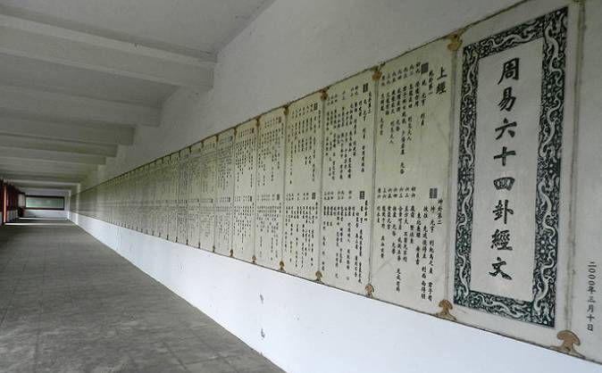另一侧则镶嵌有二十余通宋、明、清三代著名理学家、书法家程颐、朱熹、邵康节、王铎、张汉等撰书的碑、铭、诗、赋。这些碑刻对研究《易经》和书法艺术都有重要价值。