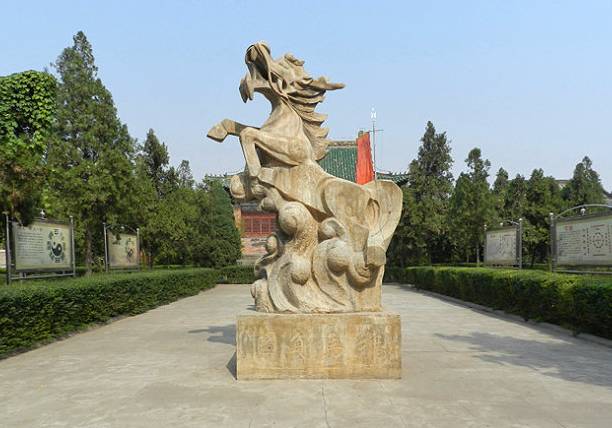 在伏羲殿之前,有一3米多高的龙马塑像,这匹龙马足踏波浪,仰首嘶鸣,栩栩如生。该寺伏羲圣像碑上也刻有龙马像,并附《龙马记》曰:“龙马者,天地之精,其为形也,马身而龙鳞,故谓之龙马。高八尺五寸,类骆有翼,蹈水不没,圣人在位,负图出于孟河之中焉。”
