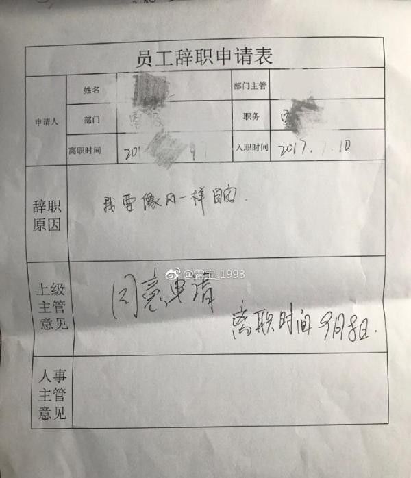 近日,一位95后江西姑娘的辞职信走红。据悉,这名女生在公司做客服不到两个月,因其在客户回访时态度不是很好,被说了几句,便申请离职,辞职原因一栏写着:“我要像风一样自由”……