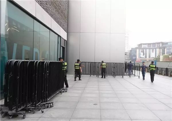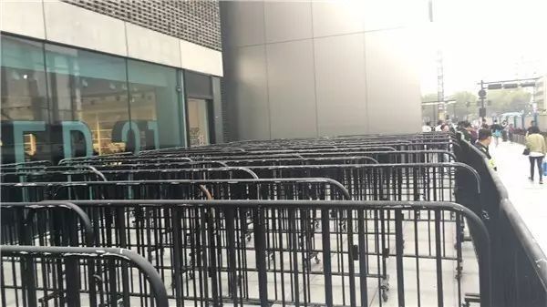 而在杭州苹果西湖店,早上6点多来了三四十个保安,黑色栅栏架势十足列了一整排,拐了几个90度的弯。8点开门前,门口就两人排队。8:43保安们开始撤栅栏……