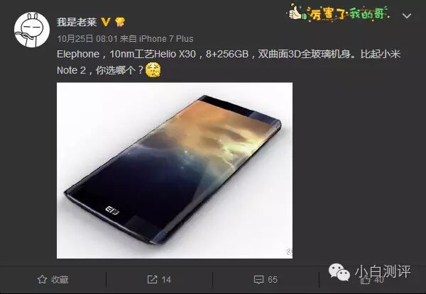 微博称Elephone,10nm工艺Helio X30,8+256GB,双曲面3D全玻璃机身。比起小米Note 2,你选哪个?”从爆料的图片来看,该机采用2.5D双曲面玻璃,完全没黑边,上下两边也非常的窄,屏幕下方是Logo“EP”,不知是不是Home键,整体非常漂亮,整个屏幕屏占比非常夸张,似乎能和小米MIX一拼。