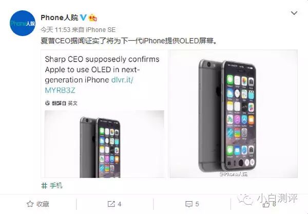 iPhone已经连续三代都没有更新过外观了,明年将是iPhone的十周年,苹果肯定会带来惊喜。今天,有微博网友爆料称,明年的iPhone屏幕将会改成OLED,并由夏普提供,目前夏普CEO已经证实了这一点。
