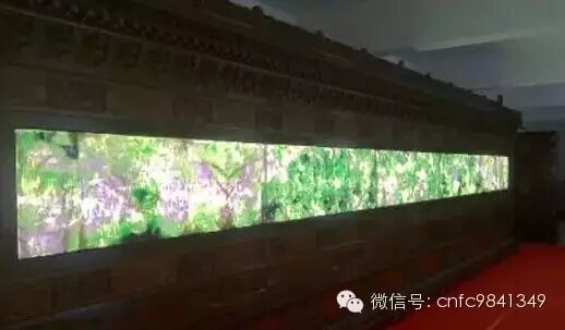 作品的木雕影壁采用名贵的金丝楠木雕刻而成,长10.15米,高2.95米,厚0.52米,总重约2吨。与此同时,在木雕框架之内,加装背光效果,可以在展示之时更加凸显翡翠玉料色彩和质地的精美。